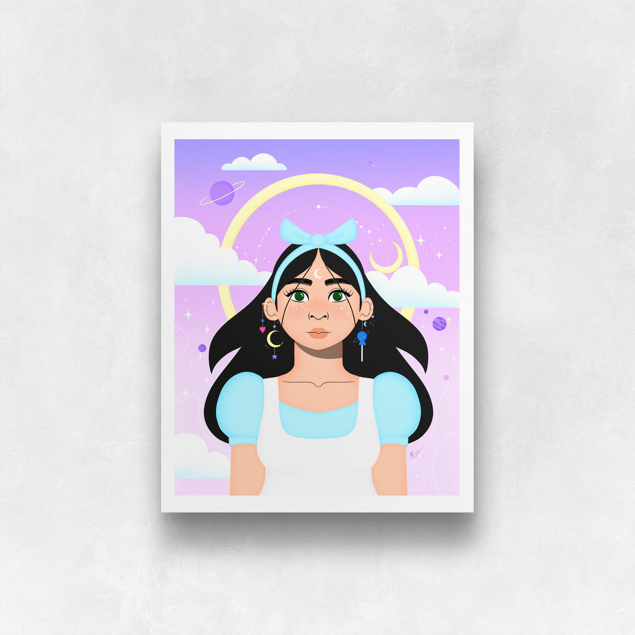 Upgrade your home decor with Stella Luna Portrait No. 4 Art Print. This unique art piece features a celestial retro-inspired character surrounded by constellations, halo, stars, clouds, and candy pieces in a bright and playful outfit inspired by Alice in Wonderland. Printed on high-quality archival paper, it's the perfect addition to any space looking for a touch of charm.